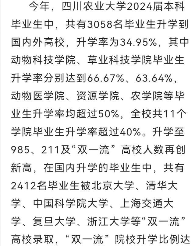 川农大的保研率和就业率,也让人挑不出毛病。目前整体保研率接近11%,部分学院甚至超过50%的升学率。本科生整体升学率接近35%,意味着每三个学生中就有一个选择继续深造。而就业率更是常年保持在90%以上,2024届本科毕业生的就业落实率达到92.37%。对于一所211大学来说,这样的数据无疑是极具竞争力的。无论是想继续读研深造,还是直接就业,川农大都给你铺好了路。